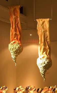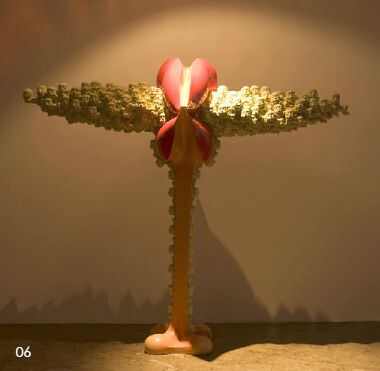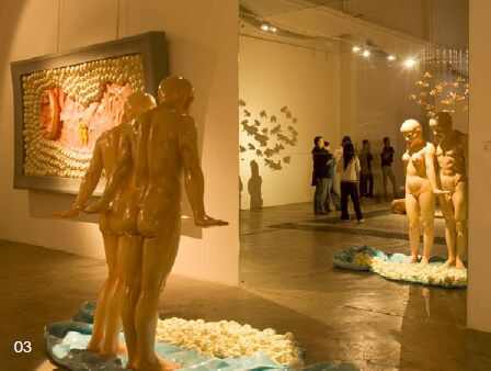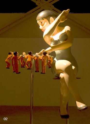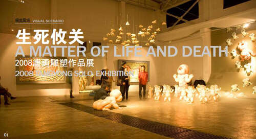 唐勇对雕塑形体的组织,已达到相当自由的程度。避孕套和香蕉人在大小、内外、完形与破裂等诸多关系上处理得得心应手。而那些单人像或双人像的塑造,往往以充满想象力的合成方式给人以眼前一亮或心中一惊的印象。这里有孩提时代的记忆,有幽默场景的调侃,还有社会典型的重新识读。而对于形体的塑造,则显得更加肯定与成熟,简练而精确,流畅婉转而又不乏力度,具有很强的形式感和雕塑性。唐勇有意放弃雕塑表面肌理塑造中常见的表现性,以其对个人特征的某种排除,来沟通当代文化表层化、流行化的集体性,实际上乃是对自我存在问题的预设。在表面色彩的处理上,唐勇颇费心思,一件作品大致两三个颜色,一色为主,其他点缀,统一在多少有些发灰的粉色中,显得沉着又不无涂层所需的矫饰感,不仅仅是表层的炫耀,使整个作品的动态和形态反而显得特别突出。这样一来,唐勇在雕塑创作中把握到一种适当的深度。他不想将自己对生命存在的体验因为深沉而过于沉重,其作品在流露出对生命脆弱与偶然的惋惜时,并不就此执著于哀叹与悲情,在那些动态各异、活泼可爱、熙熙攘攘、热热闹闹的小生命中,我们似乎能听到嘻嘻哈哈的笑声。唐勇对人是乐观而积极的,他只想用自己的方式提出当代文化存在的问题,让人在快乐原则的支配下有所思考,有对于生命价值和精神意义的反询:在上帝死了之后,人是无法找到精神归宿的;而在人死了之后,人也是无法在快乐原则中安身立命的。人失去了为信仰所假定的终极的哲学本质之后,只能在其存在状态和生命过程中现实性地去寻找自己。没有本质化的精神,只有矛盾性的心理,只有在矛盾的、异在的精神心理之中,艺术才能挑战既成文化的操控性,释出个人自我独有的能量,与社会交换、博弈、流通,介入社会并为个性生长和人心自由提供解放的可能性。
