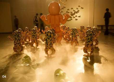 这一批作品的突出特点是强化对比,在形体大小的强烈对比中有意造成密集和繁复。乍一看,有种爆米花在微波炉里噼啪炸响、膨胀爆出的感觉。这种不可遏制的繁殖力是唐勇对生命存在的体会。比如精子,一次喷射出成千上万,在显微镜下都带着尾巴在向前游动,但这些可爱的小家伙能有多少成为生命的事实?小青蛙也是如此,在日益污染的生态环境中它们何去何从?而人呢,像兵马俑一样成为消费大军的人,文化工业和数字图像灌铸的人,还有将来被基因技术、美容医学改变的人,其中多少人还有真正的自我而能够独立的生存?唐勇的雕塑借助数码时代的图像特征,非常机智地将生命的繁殖力和数像的复制性结合在一起,使其作品既新鲜又耐看,在好看中显得特别,在特别中显得异样,在异样中揭示出精神心理深度的矛盾。